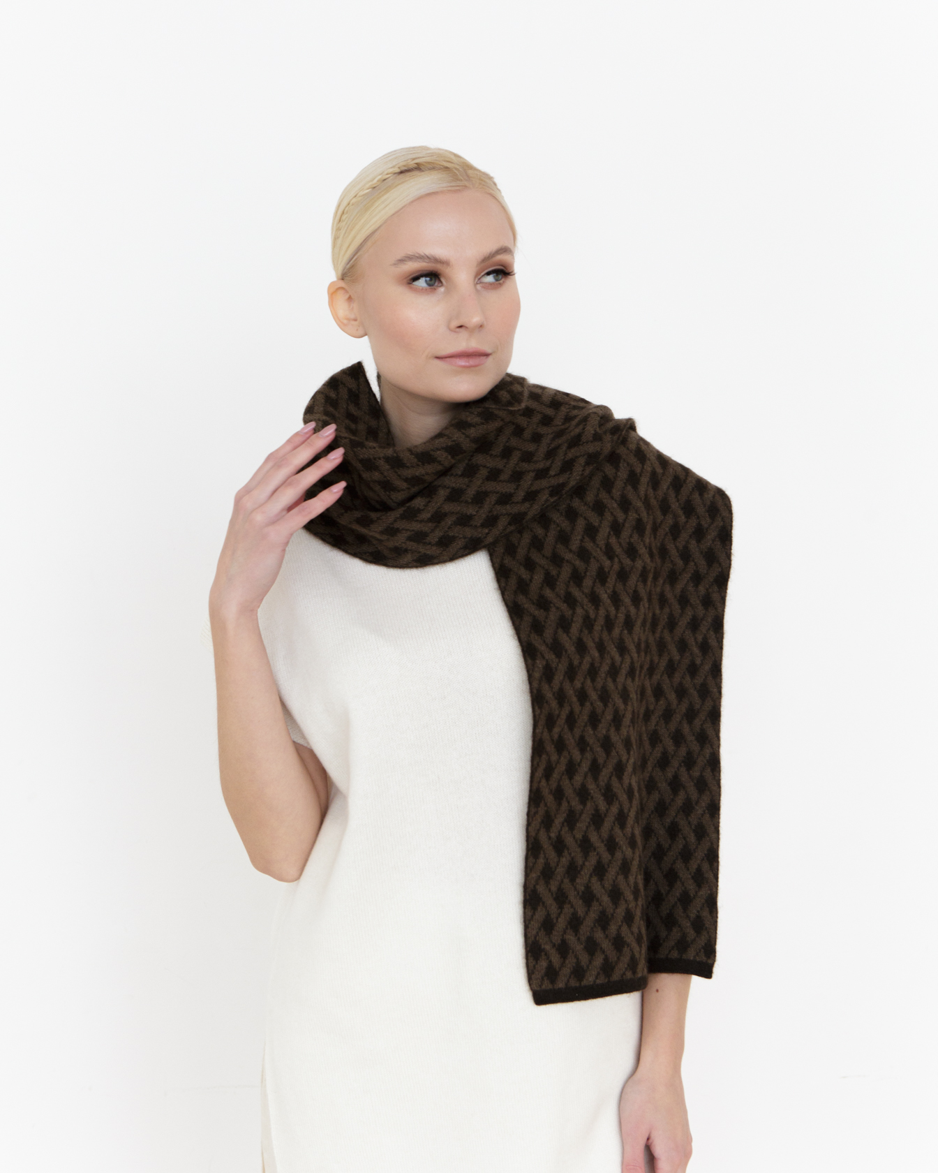 Элегантный шарф из пуха яка — теплый и выразительный аксессуар для холодного сезона. Модель привлекает внимание фактурным геометрическим узором и благородной цветовой гаммой. Шарф легко дополняет повседневные и элегантные образы, создавая ощущение уюта и стиля.