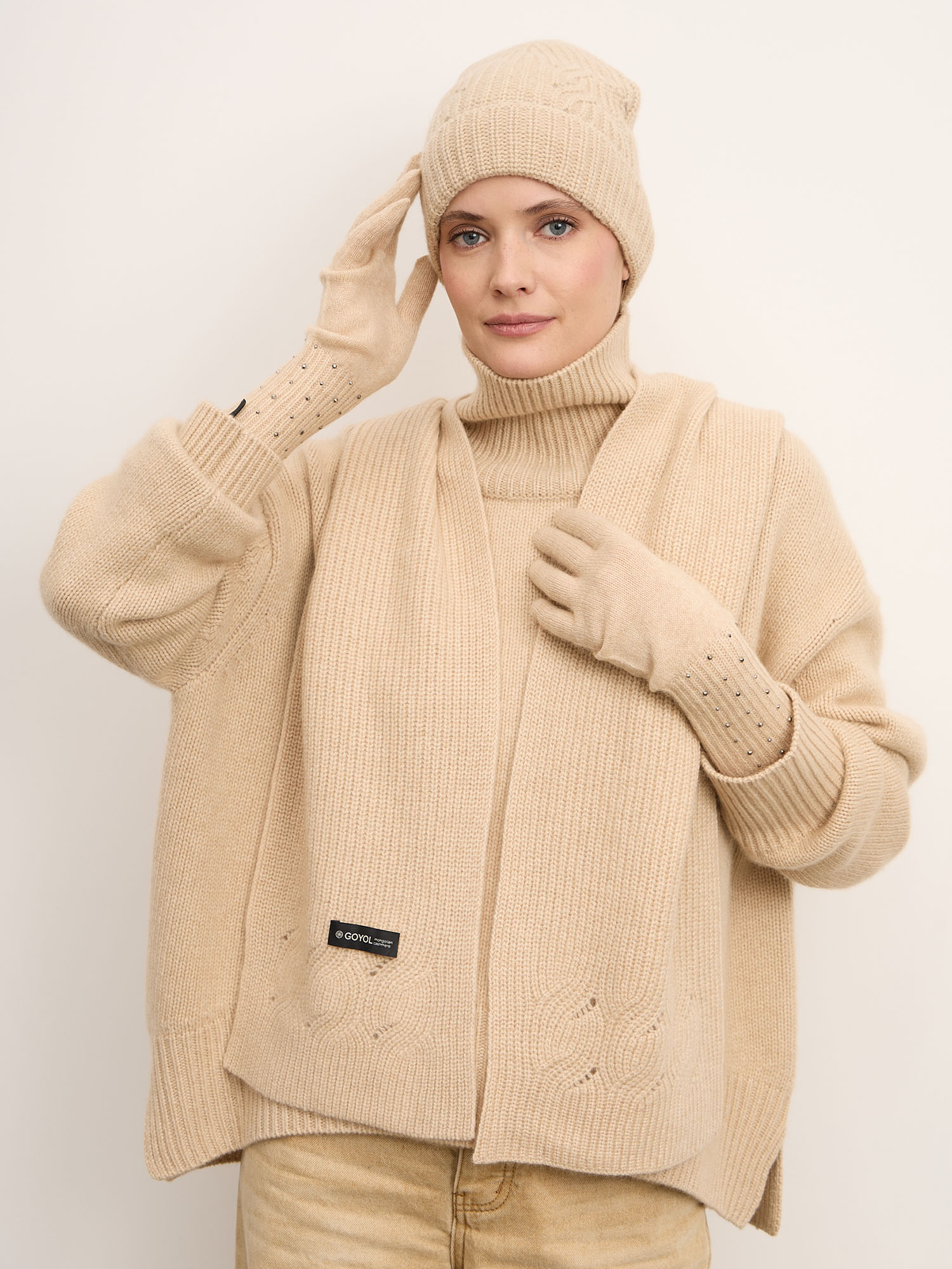 Кашемир с длинным волокном устойчив к износу и сохраняет мягкость на протяжении многих сезонов. При правильном уходе изделие не теряет форму, а качественно закрепленные стразы сохраняют аккуратный внешний вид