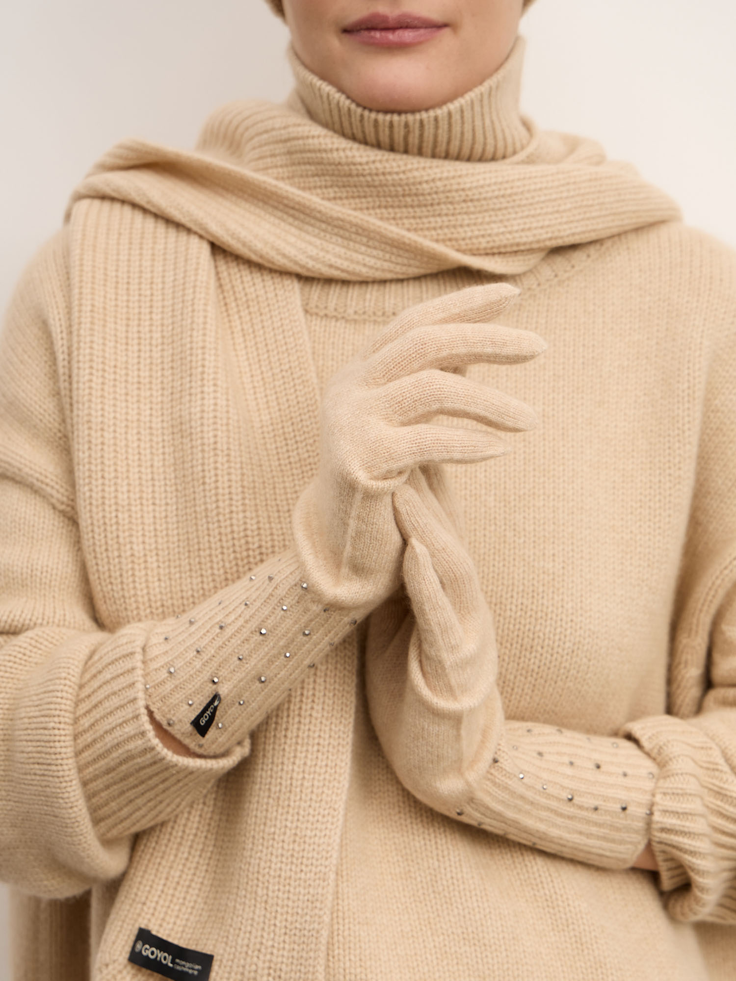Бежевые кашемировые перчатки с декоративными стразами — это изысканное сочетание уюта и деликатного сияния. Они мягко окутывают руки теплом, а аккуратный блеск на манжетах добавляет образу женственности и элегантного акцента. Идеальный аксессуар для тех, кто ценит комфорт и стильные детали.