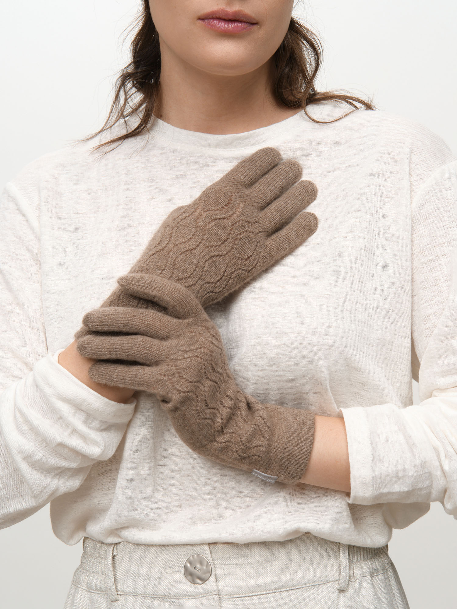 Ажурный вязаный узор придаёт модели утончённый и женственный характер. Аккуратная манжета обеспечивает комфортную фиксацию и завершает лаконичный, элегантный образ.