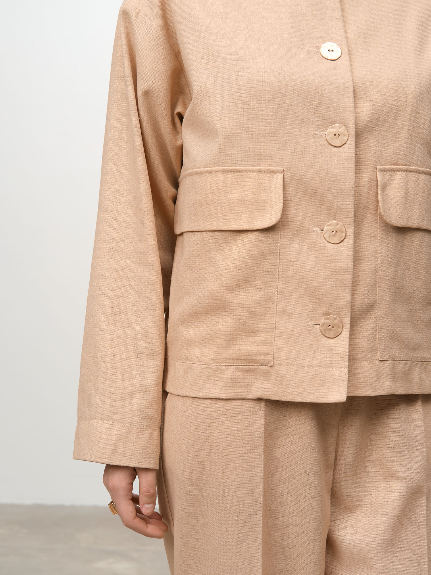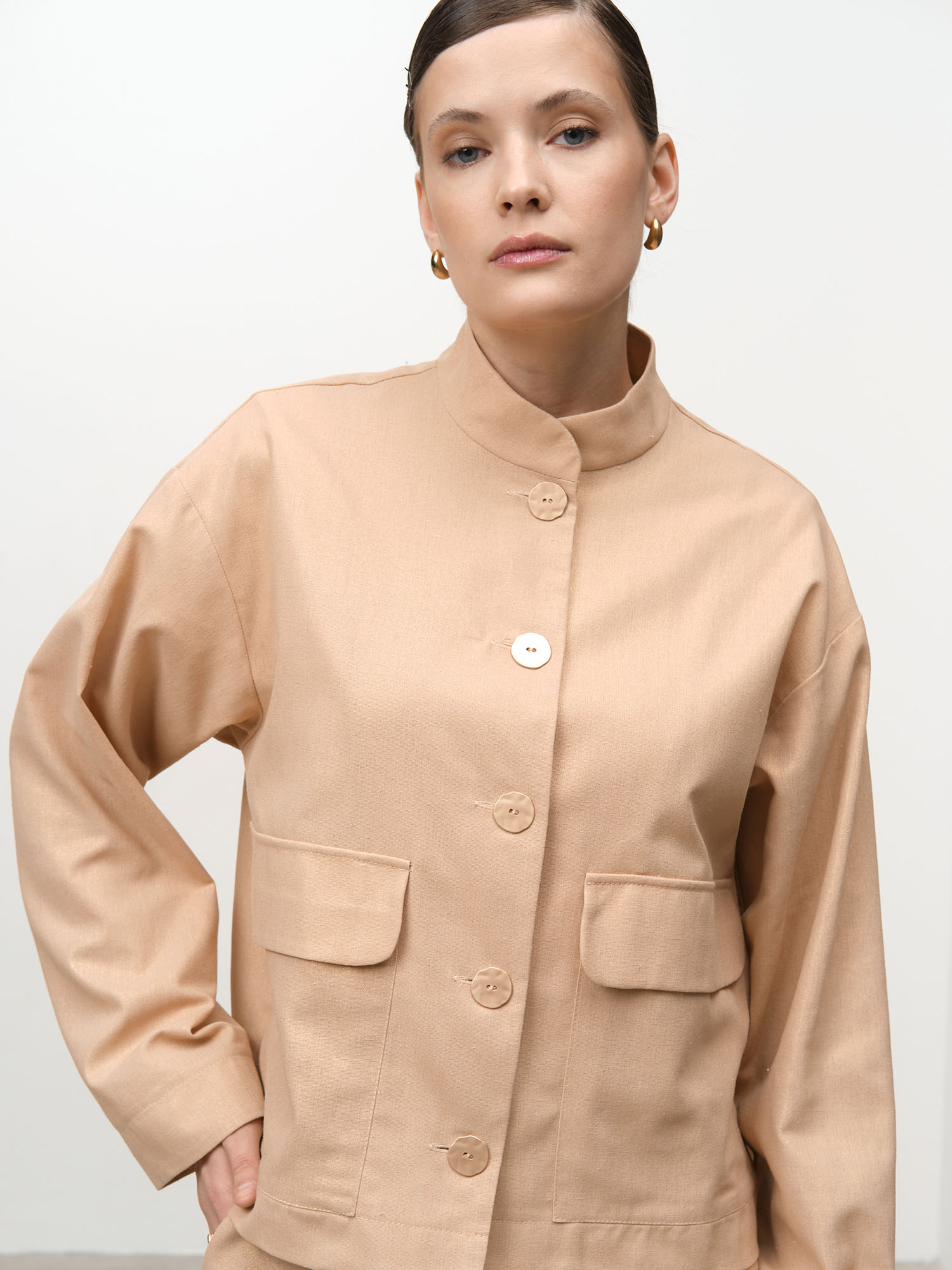 Застежка на пуговицы, накладные карманы, воротник-стойка, аккуратная обработка швов, легкая фактурная ткань.