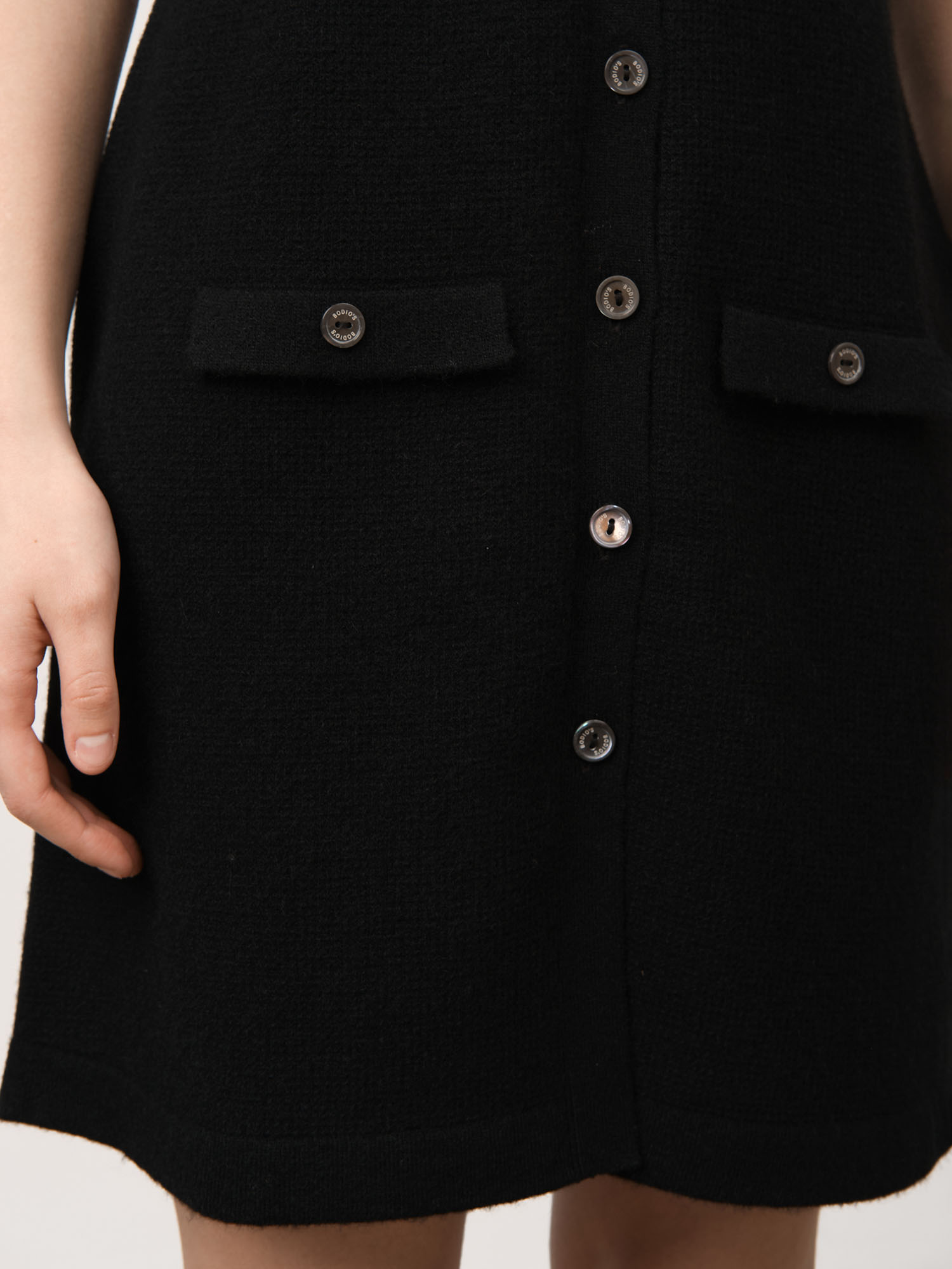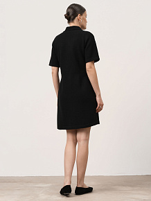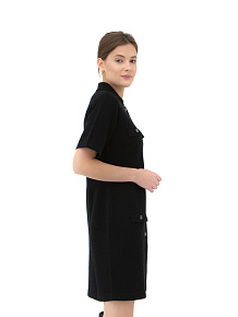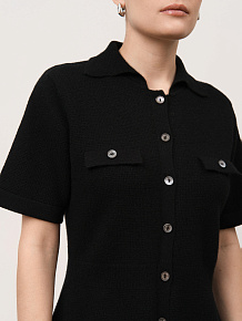 Классический отложной воротник, застёжка на пуговицы по всей длине и накладные карманы создают сдержанный, структурный образ. Короткий рукав делает платье универсальным для демисезонного периода.