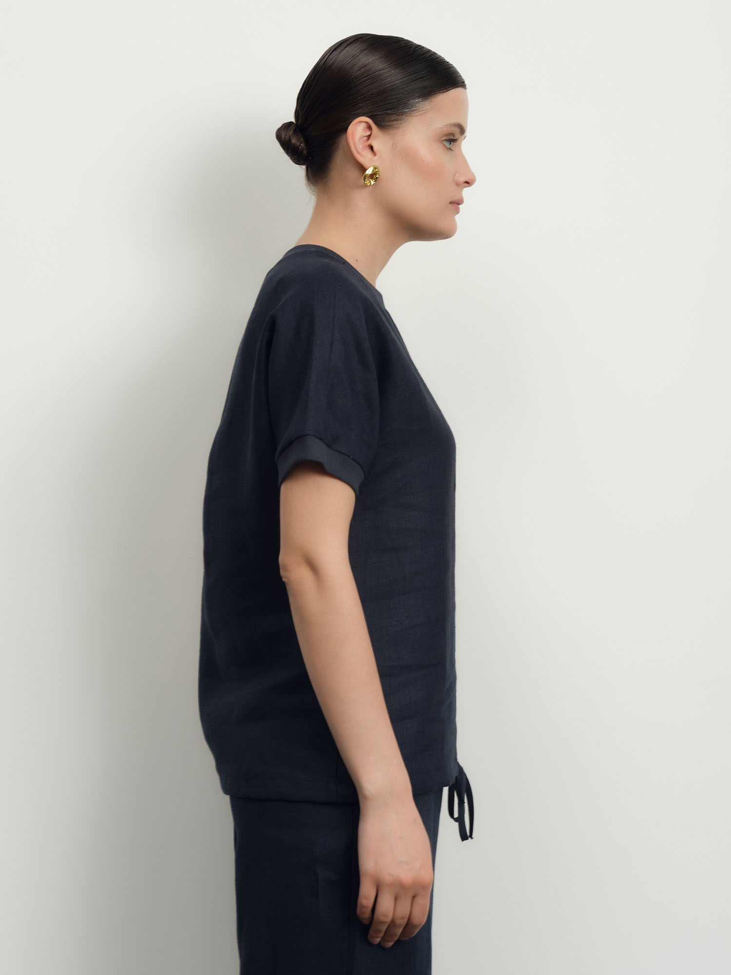 Круглый вырез, мягкая линия плеча, аккуратная обработка швов, легкая текстура ткани.