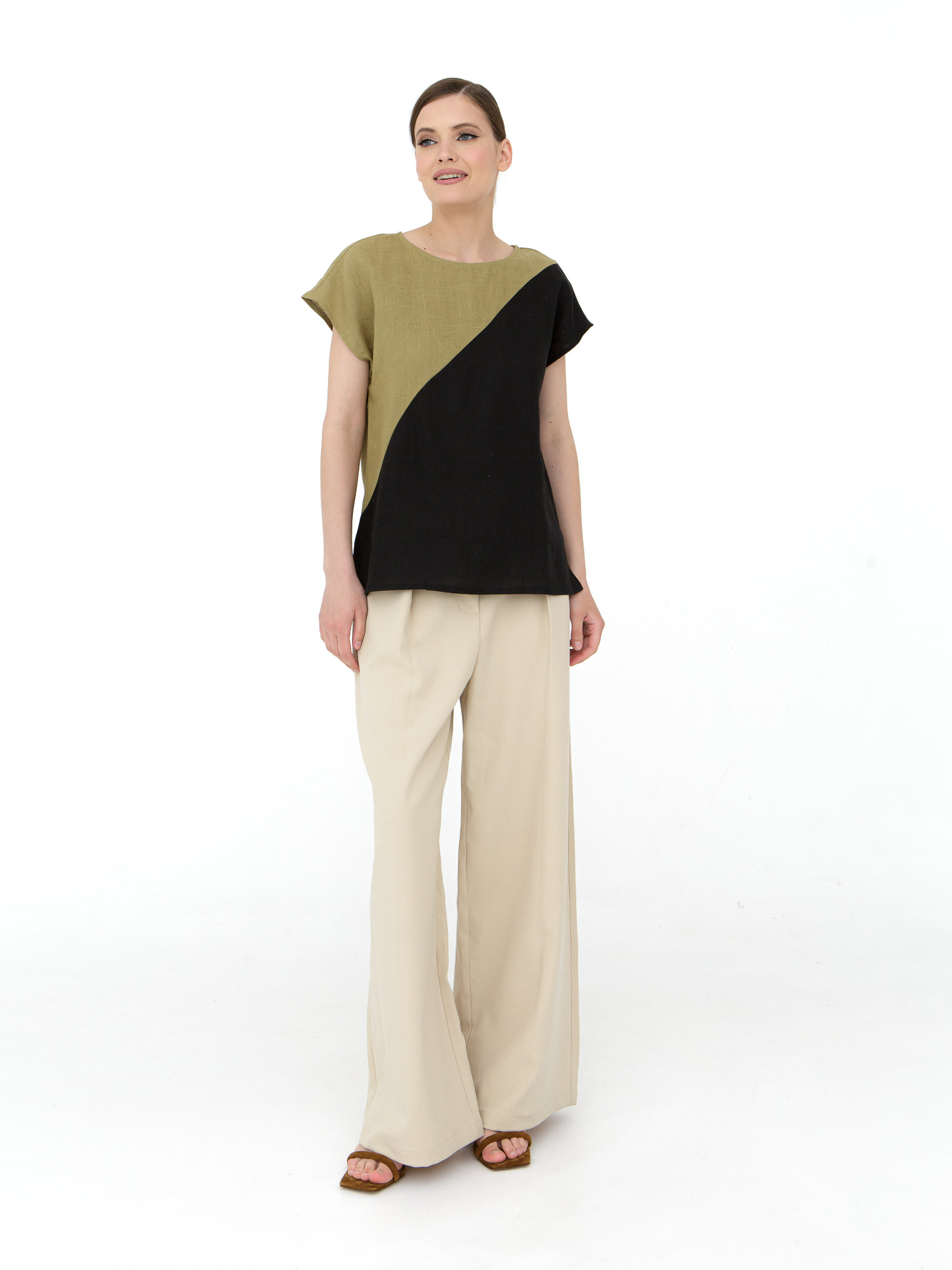 Свободный прямой крой с лаконичным силуэтом. Модель выполнена в минималистичном стиле с акцентом на асимметричное цветовое деление, что придает образу динамичность и современность. Короткие цельнокроеные рукава создают мягкую линию плеч.
