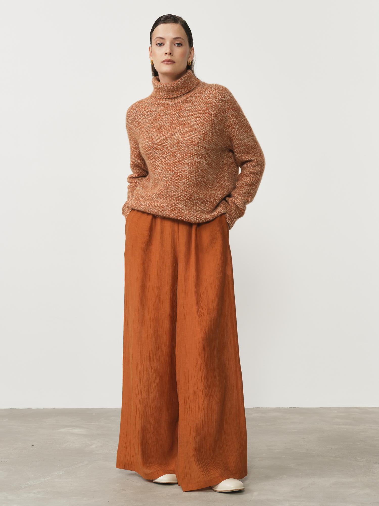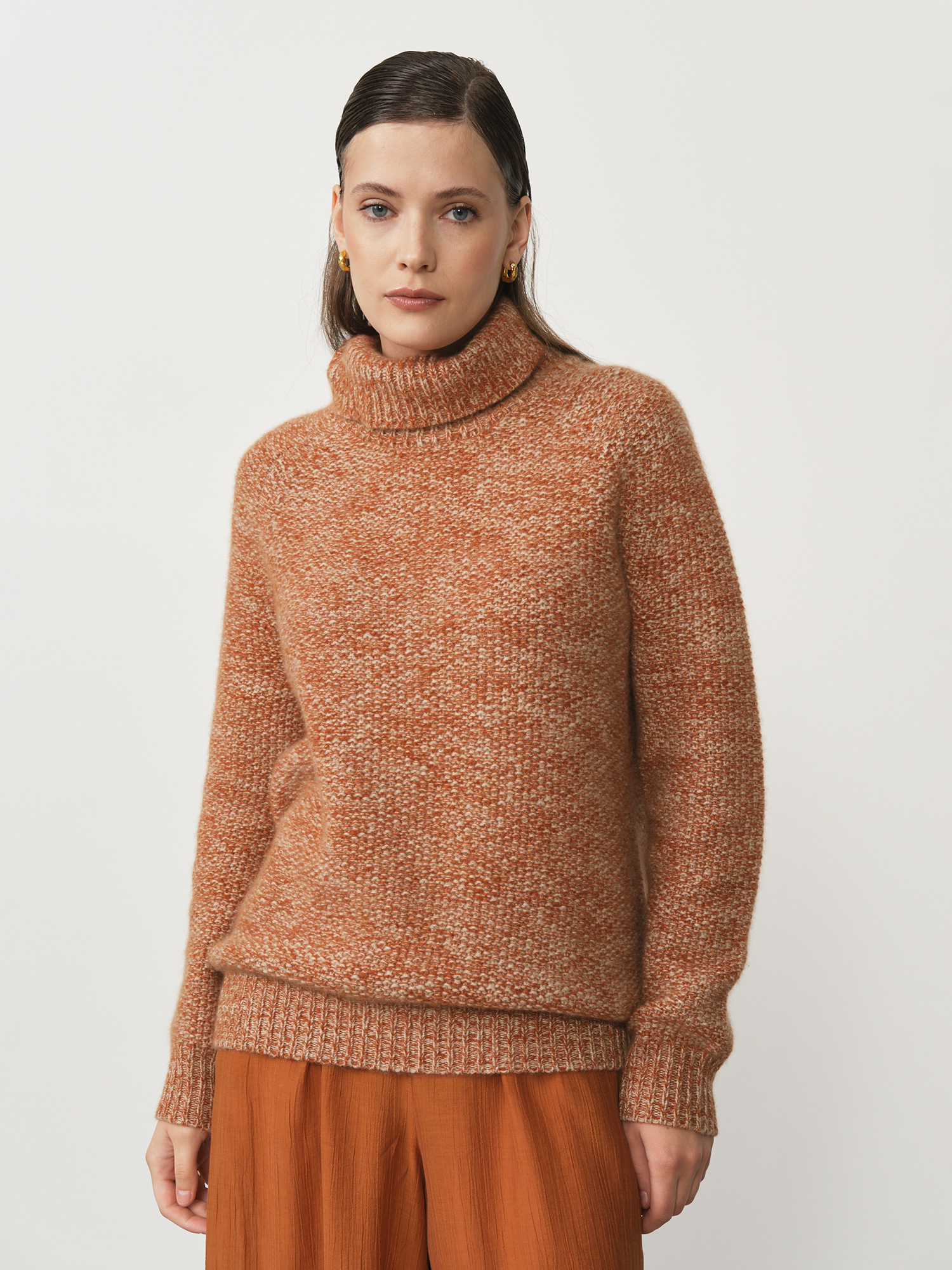 Элегантный кашемировый свитер в рыжем меланжевом цвете — идеальный выбор для тех, кто ценит комфорт и стиль. Мягкий и уютный, он выполнен из высококачественного кашемира, который дарит нежное прикосновение к коже и сохраняет тепло в холодные дни. Свитер отличается классическим дизайном с высоким воротом, обеспечивающим дополнительную защиту от холода.