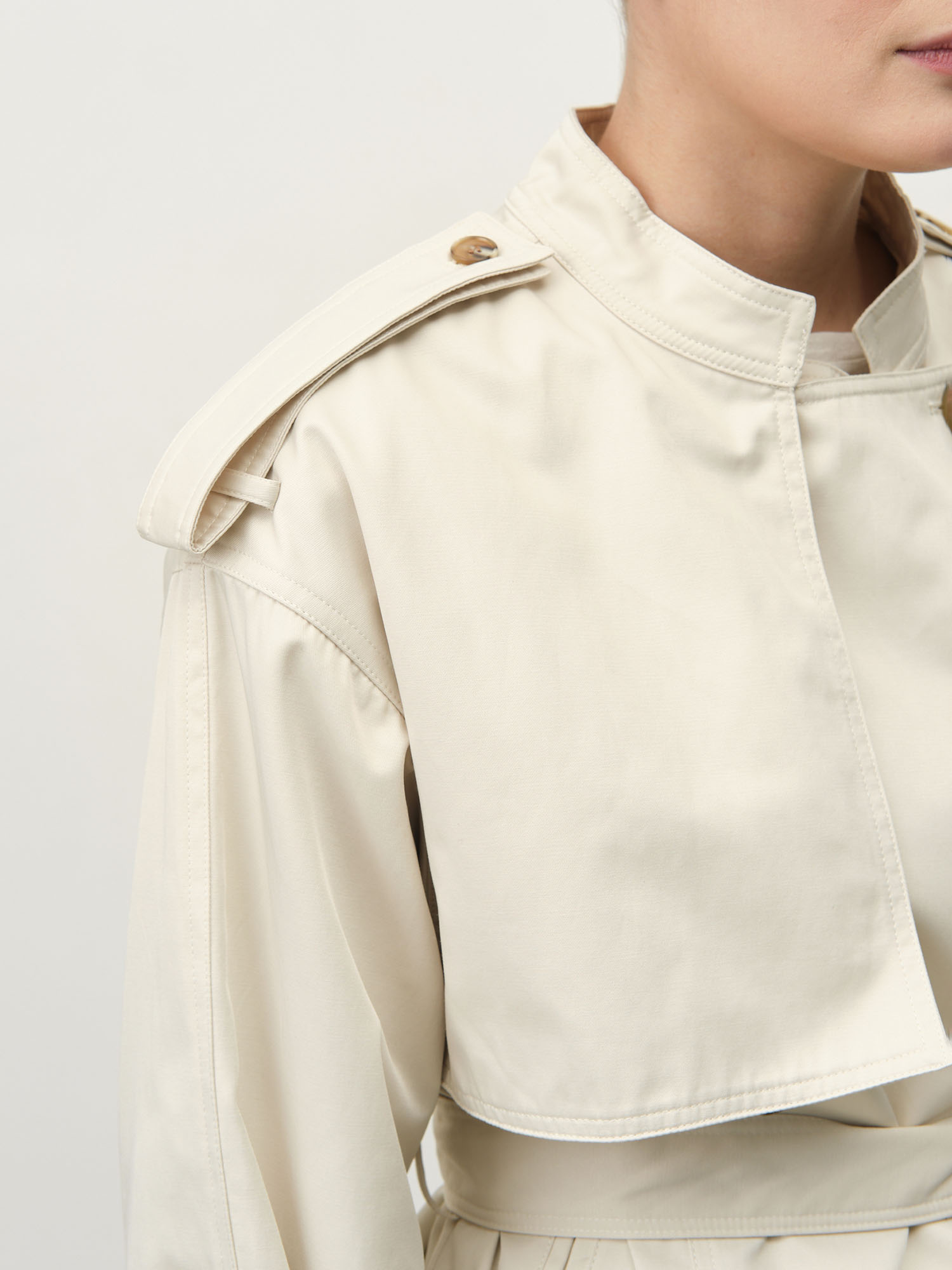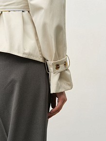 Приталенный силуэт с поясом, укороченная линия верха с декоративной кокеткой. Современная интерпретация классического тренча с выразительными элементами.