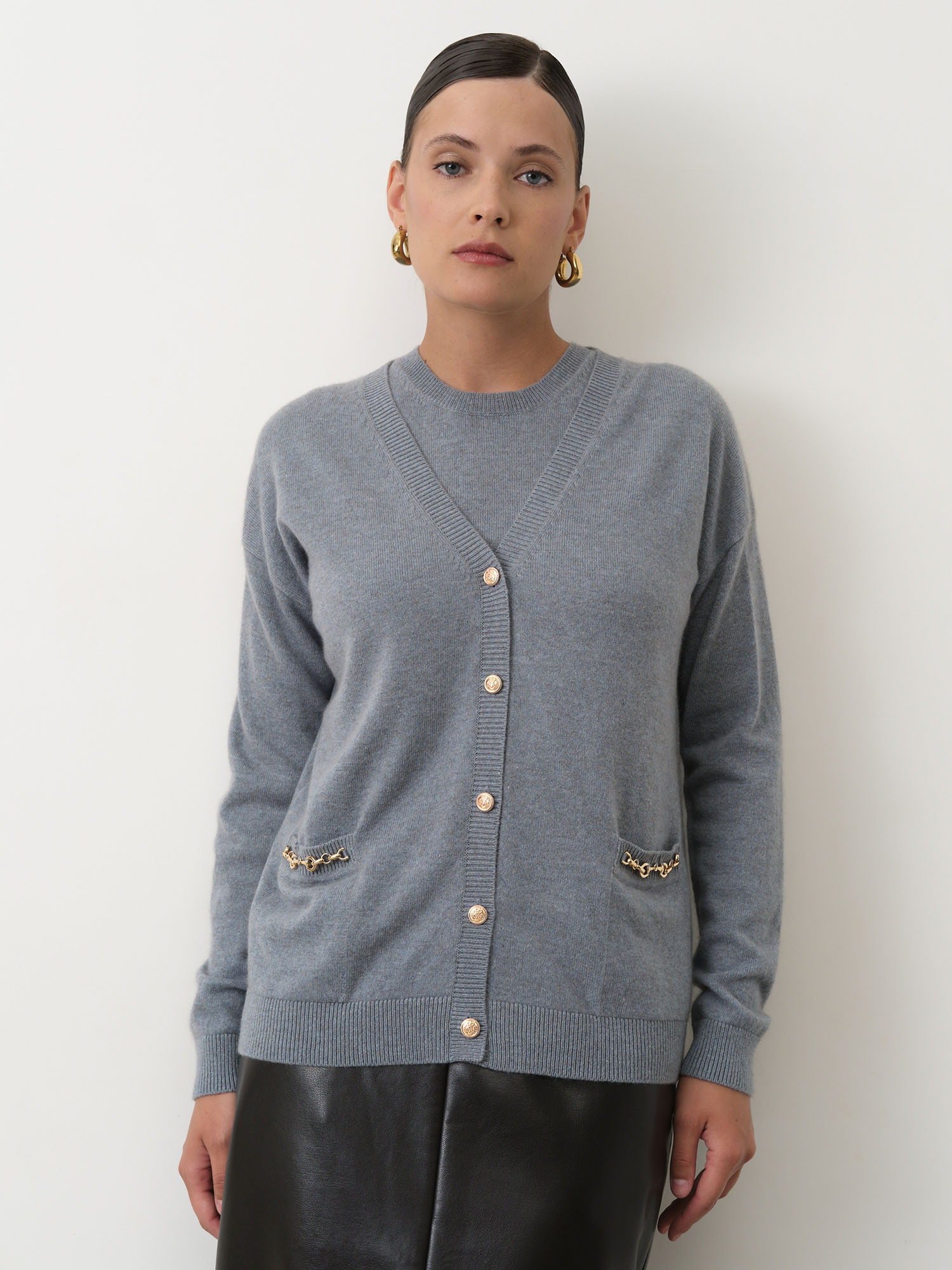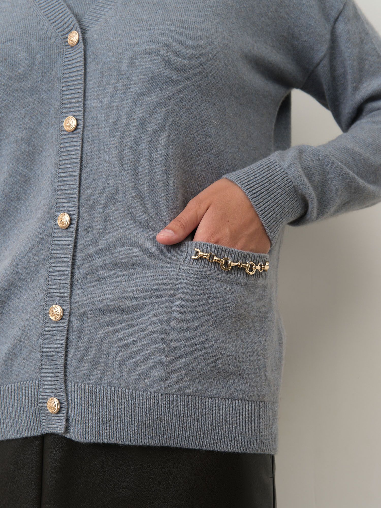 Застёжка на пуговицы, декоративные карманы с отделкой и изящными элементами, аккуратная трикотажная отделка манжет и нижнего края. Ровная вязка сохраняет форму изделия и подчёркивает качество материала.